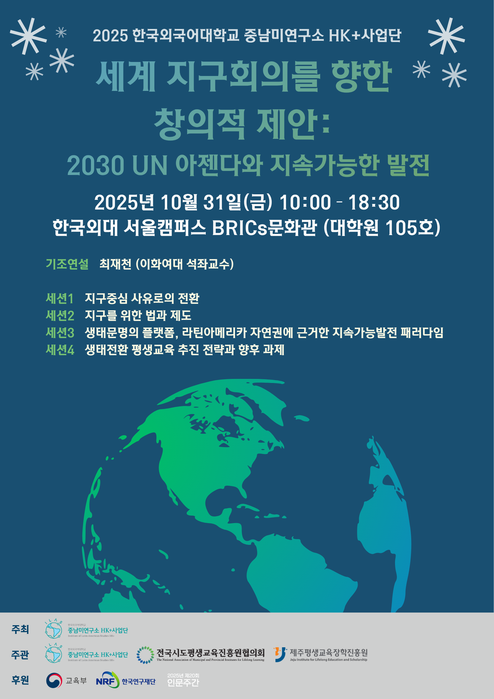 □ 제주평생교육장학진흥원(원장 진희종)은 오는 10월 31일(금) 한국외국어대학교 서울캠퍼스에서 열리는 「세계 지구회의를 향한 창의적 제안: 2030 UN 아젠다와 지속가능한 발전」 학술대회를 공동 주관한다고 밝혔다. |