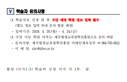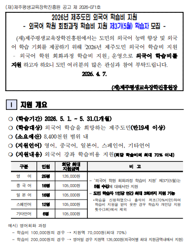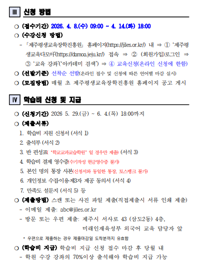 | 강좌명 | 2026년 제주도민 외국어 학습비 지원 - 외국어 학원 회화과정 제3기(5월) 학습비 지원 학습자 모집(기타언어) - 접수마감 | 계좌번호 | |